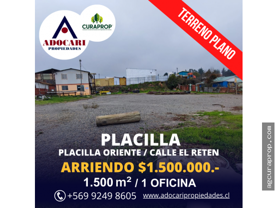 Valor: Arriendo $1.500.000 + honorarios corredor Amplio terreno en Placilla Oriente, Valparaiso ¡Oportunidad única para el rubro comercial en sector Placilla Oriente! Este amplio terreno de 1.500 m2 para fines comerciales se ubica en una zona tranquila, conectada y con excelente proyección de plusvalía en la comuna de Placilla de Peñuelas PRINCIPALES CARACTERÍSTICAS: Superficie total: 1.500 m² Estacionamiento: Capacidad para mas de 10 vehiculos Presenta una casa con oficina SOLO EL PISO 2. (piso 1 no está habilitado) Portón electrico DIRECCIÓN DE REFERENCIA: Calle el Reten, Placilla de Peñuelas Con excelente conectividad hacia: Calles principales de la comuna Ruta 68 (5 min) Centro de Valparaíso (20 min) Comercio de la comuna