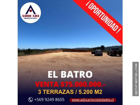 VALOR VENTA: $75.000.000 .- (+ Comisión 2% + IVA) UBICACIÓN: El Batro, Casablanca, Region de Valparaiso, Chile. Se vende hermosa y gran parcela de aproximadamente 5.200 m2 en sector El Batro, con acceso por portón a la Parcelación,con hermosas vistas al Valle de Casablanca. El terreno ya se encuentra intervenido por maquinas para llegar y construir en 3 terrazas planas en desnivel. A 35 minutos de Valparaiso, 50 minutos de Viña del Mar y 1 hora 30 minutos de Santiago. DISPONIBLE: Contra pago. CARACTERÍSTICAS: Portón de acceso Caminos de tierra Parcela de 5.200 m2 3 Terrazas planas