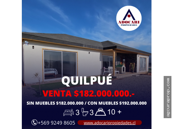 VALOR VENTA: $182.000.000 SIN AMOBLAR.- $192.000.000 AMOBLADA (+ Comisión 2% + iva) UBICACIÓN: Ruta F-50, Kilómetro 22, Los Molles, Quilpué, V Región, Chile. Parcela de 5.000 m2, muy bien ubicada. A 15 minutos de Quilpué, a 10 minutos de Villa Alemana y a 15 minutos de la ruta 68 por la ruta F-50 Camino Lo Orozco. DISPONIBLE: Contra pago. CARACTERÍSTICAS: Parcela de 5.000 m2 con casa de 3 dormitorios, 3 baños, estacionamientos y piscina 5.000 m2 aprox de terreno 164 m2 construidos Casa de 1 piso Hall de entrada Living y comedor en amplio espacio Cocina abierta amoblada y equipada con encimera, horno y campana empotrada Logia Despensa 1 dormitorio principal con baño en suite y walking closet 2 dormitorios 1 baño de visitas 1 baño en pasillo equipado con shower 1 baño en suite equipado con shower Piscina Terraza techada Patio Estacionamiento para + 10 vehiculos OTRAS CARACTERÍSTICAS: Pozo Piscina