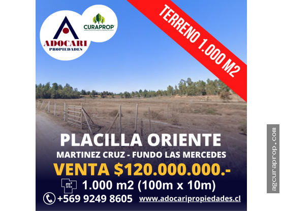 Adocari Propiedades VENDE terreno de 1.000 m2 totalmente planos en un sector exclusivo y tranquilo, con terrenos y propiedades rodeadas de naturaleza. Un lugar perfecto para disfrutar de la vida al aire libre y la tranquilidad. El Fundo Las Mercedes, cuenta con acceso a áreas verdes y vistas naturales. Un lugar ideal para vivir o invertir. UBICACIÓN: Calle Martinez Cruz, Fundo Las Mercedes, Placilla Oriente, V Región. CARACTERÍSTICAS: Terreno totalmente plano de 1.000 m2 PRECIO LISTA DE VENTA: $120.000.000.- + Comisión de Corretaje (2% + IVA) 1.000 m2 de terreno (incluye paso de servidumbre) Dimensiones: 100 x 10 metros Cuenta con medidor de luz propio Factibilidad de agua y alcantarillado Perimetro cercado con panderetas Según el CIP la zona donde se encuentra el terreno es Zona de Extensión Urbana Tiene detalle de ZEU 2, destinado para usos especificos como viviendas unifamilairies o multifamilaires, comercios o industrias