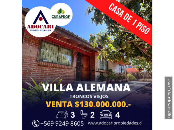 ¡ADOCARI PROPIEDADES VENDE AMPLIA CASA DE 1 PISO EN TRONCOS VIEJOS¡ VALOR: $130.000.000 + Honorarios corredora PRINCIPALES CARACTERÍSTICAS: Amplio terreno de 300 m2 Superficie contruida: 90 m2 Casa de 1 solo nivel Living/comedor en espacio comun con chimenea Cocina cerrada 3 Amplios dormitorios 2 baños (1 completo en el interior y un medio baño en el exterior) Antejardin Estacionamiento con capacidad para 4 vehiculos ENTORNO Y CONDOMINIO: Cercano a Supermercado Santa Isabel Cercano a Colegios Cercano a feria local Cercano a comercio local Cercano a locomocion a 15 minutos de acceso Autopista Troncal sur