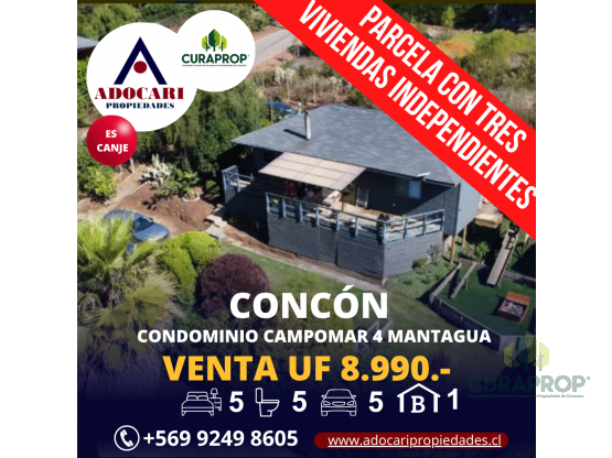 Se vende espectacular parcela de 2.500 m² con tres viviendas independientes, ubicada en un entorno natural y seguro, a solo 15 minutos de Concón y 30 de Maitencillo. Perfecta para vivir, invertir o disfrutar en familia.